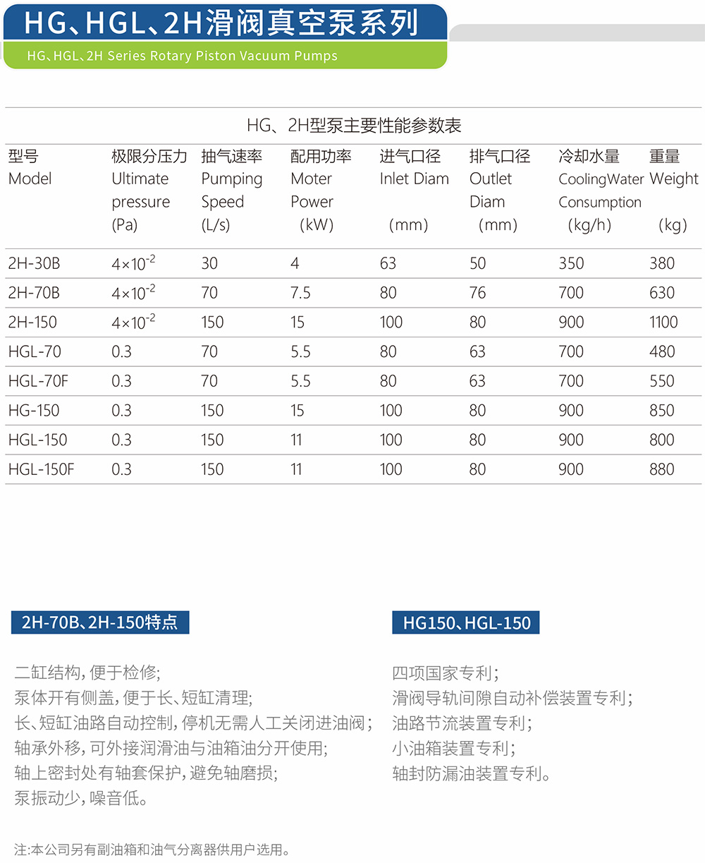 Rotary piston vacuum pump is suitable for pumping air and other ordinary gases, when a gas ballast valve is used it can also pumpcondensable gases. The pump must be filted with appropriate accessories if gas is rich in oxygen, explosive, corosive to ferrous metalchemical reactive with vacuum pump oil. The HGL, HG pump can be operated singly or as a backing pump combined with other higfvacuum pump, such as difusion pump and oil booster pump. lt is widely used in the industry of vacwum coating, vacuum heattreatment, vacuum impregnation, vacuum smelting, vacuum drying, molecular distilation and alitude simulation testing.